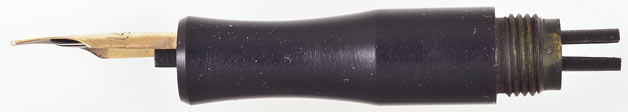 The screw cap has an imprint with an arrow at its top to show which way to turn it to unscrew, another typically early feature. The feed is notable, consisting of two flat fingerlike projections, with a narrow rectangular projection below. The projections are so flat they reminded me of the Wirt safety, and sure enough there is a axial post inside the cap that extends under the feed when the cap is on, making contact with the rectangular projection, which can slide back and forth. Clearly it was originally spring-loaded, and the post would push it down and seal the central hole in the feed when the cap was fully tightened.