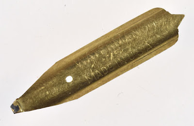 Unfinished nibs don't turn up that often. This one is a 1940s Waterman nib for a Taperite, which has been shaped, imprinted, and tipped, but hasn't had its slit cut or tip ground.