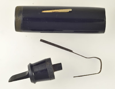 Routine soaking of barrels is also a bad idea. Removing a hardened sac is best done dry, using hooked extracting tools and cylindrical or tubular scrapers. And water inside a barrel can do serious harm to any metal parts inside – harm that may take some time to become apparent. Springs and pressure bars can corrode, while the C-shaped retaining springs typically used to hold levers in place are notoriously prone to rust. Even when the interior of a lever-filler barrel is quite dirty, there's little to be gained by scrubbing it clean, and much at risk. Pens with barrels which directly hold ink, whether eyedropper-fillers or pump-fillers, do need to have their interiors scrubbed out, but this doesn't require soaking, or at least the soaking of anything but the interior.