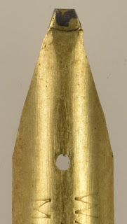 At first glance, it might seem that there is no tipping yet attached. The tip is visibly thicker, yet it seems to be all of the same 14K gold alloy as the rest of the nib, whether viewed from above or below. This, however, neatly illustrates how older gold nibs were often tipped -- and especially those with wider oblong tips.